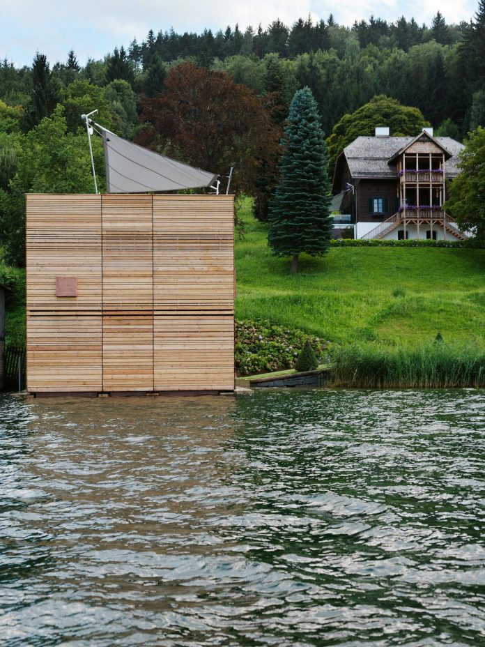 “The boathouse was built as a solitary building at the Seebodner lakeside of the Millstätter lake in Carinthia. The location of the construction is characterized by the intersection line between water and soil, directly at the foot a precipitous slope in which also the remaining buildings of the property complex are situated. Due to their elevated position, those houses have an extensive view at the south and the west façade of the boathouse.